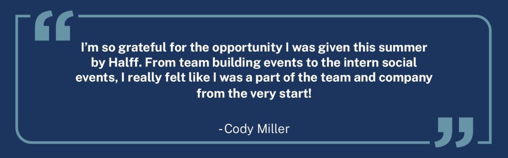“Definitely my team. They’re amazing people who have taught me well throughout my time here as an intern. They’re always willing to help and go the extra mile to help me succeed here at Halff.” – Sebastian Martinez, Transportation, 2024